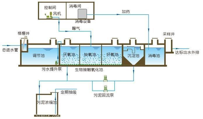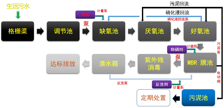 集裝箱式一體化污水凈化設(shè)備的重要部件是膜生物反應(yīng)器(MBR)。污水進(jìn)入MBR系統(tǒng),A區(qū)為兼氧區(qū),放置填料,并與活性污泥進(jìn)行充分接觸;O區(qū)為好氧區(qū),放置膜組器,使用MBR膜將活性污泥和大分子有機(jī)物質(zhì)截留住,省掉二沉池。活性污泥濃度因此提高,水力停留時(shí)間(HRT)和污泥停留時(shí)間(SRT)可以分別控制,而難降解的物質(zhì)在反應(yīng)器中不斷反應(yīng)、降解。進(jìn)一步處理之后,被處理水可以達(dá)標(biāo)排放或回用。此外,輸送到MBR系統(tǒng)中的空氣也是處理過程中重要的一部分,它可以促進(jìn)反應(yīng)器中流體的循環(huán)流動,提高活性污泥的降解效率,還可以使中空纖維膜膜絲之間發(fā)生相互摩擦,清潔膜組件。