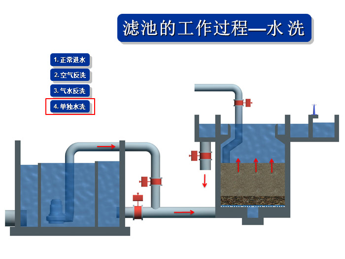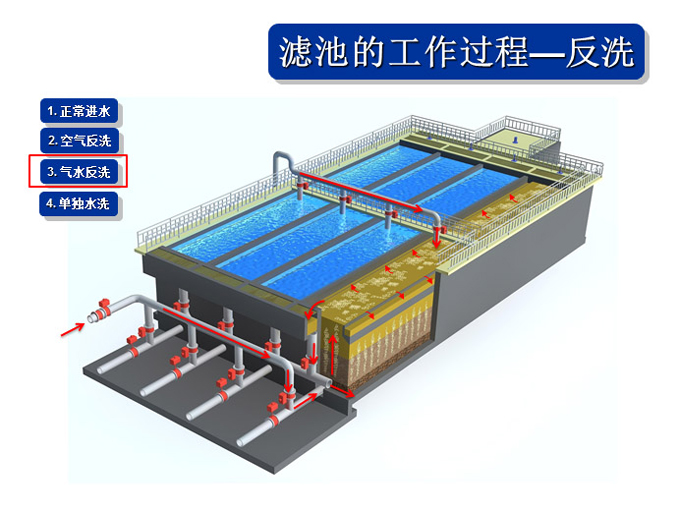 1、氣水聯(lián)合反沖冼裝置、布氣裝置、操作工藝等系統(tǒng)集成技術解決直接過濾、生物濾池生物膜脫落堵塞濾池的問題。