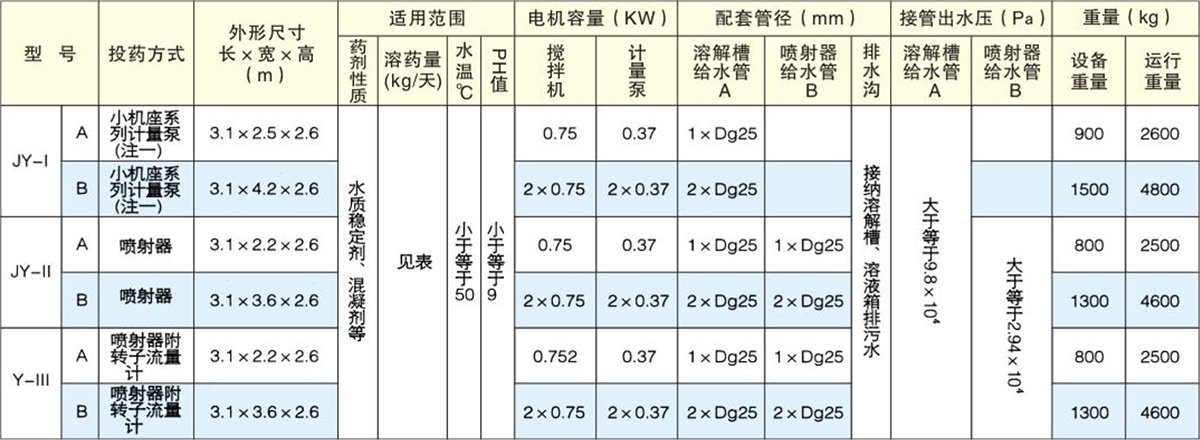 JY型加藥裝置三種型號(hào)都由三大部分組成:1、攪拌機(jī);2、溶液槽;3、計(jì)量裝置及投加設(shè)備。