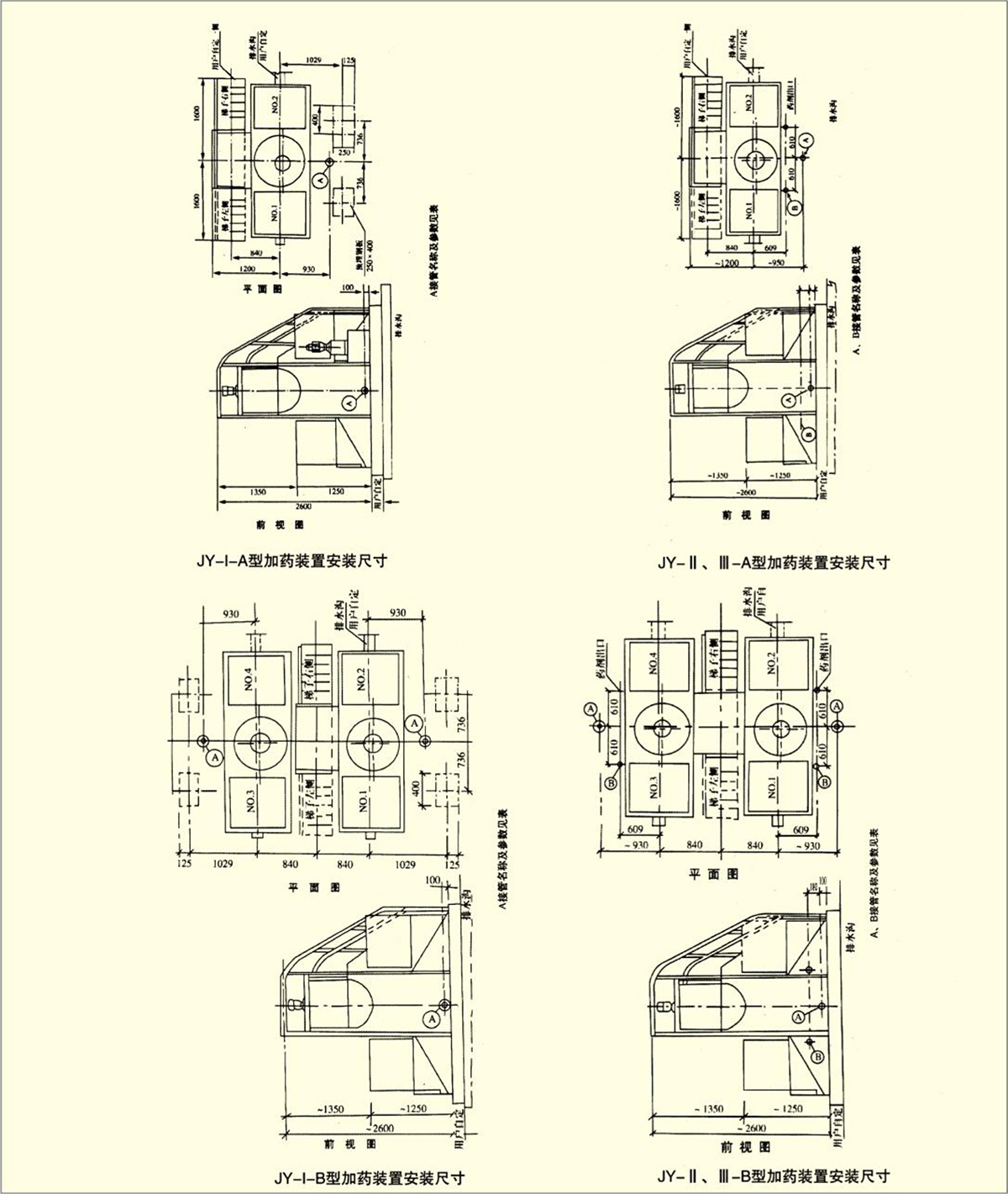 JY型加藥裝置配有一個(gè)玻璃鋼材質(zhì)的藥劑溶解槽,并配有一套電動(dòng)攪拌機(jī),兩個(gè)藥劑溶液箱,一套投藥裝置及配管、鋼制平臺(tái)梯子等原件組成一個(gè)整體。