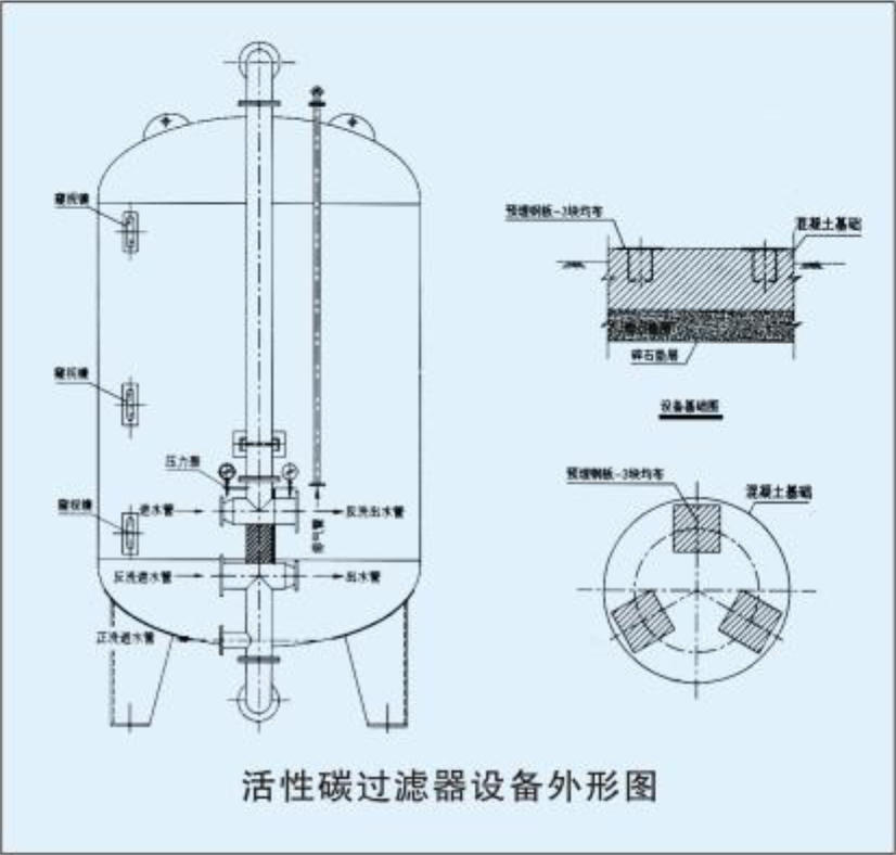 該活性炭過濾器主要由活性炭層和承托層組成。活性炭具有發達的孔隙,比表面積大,具有很高的吸附能力。正是由于活性炭的這種特性,它在水的深度處理中被廣泛使用,如生活給水,污水后段的(凈水)深度處理等。